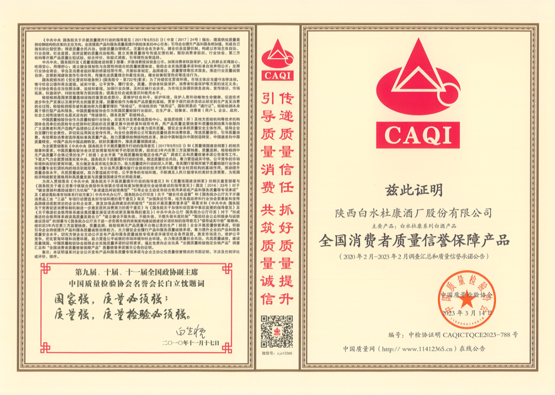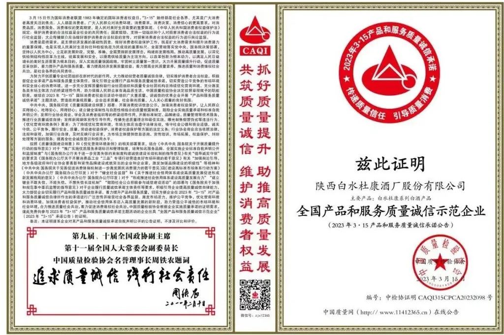 “3·15”國際消費者權益日,陝西91桃色视频观看酒廠股份有限公司和旗下的“91桃色视频观看”品牌,順利通過中國質量檢驗協會“近三年經全國第三方監督抽查、質量檢測、檢驗檢測,且無產品質量不合格記錄”等嚴格篩選,應邀參加2023年“3·15”國際消費者權益日“產品與服務質量誠信承諾”主題活動,在中國質量網、中國質量信譽網、中國質量報、中國消費報等媒體平台上,進行產品與服務質量公開承諾,誠懇接受廣大消費者監督。中國質量網也為其出示了“全國產品與服務質量誠信示範企業”“全國消費者質量信譽保障產品”“全國白酒行業領先品牌”等三份證明。