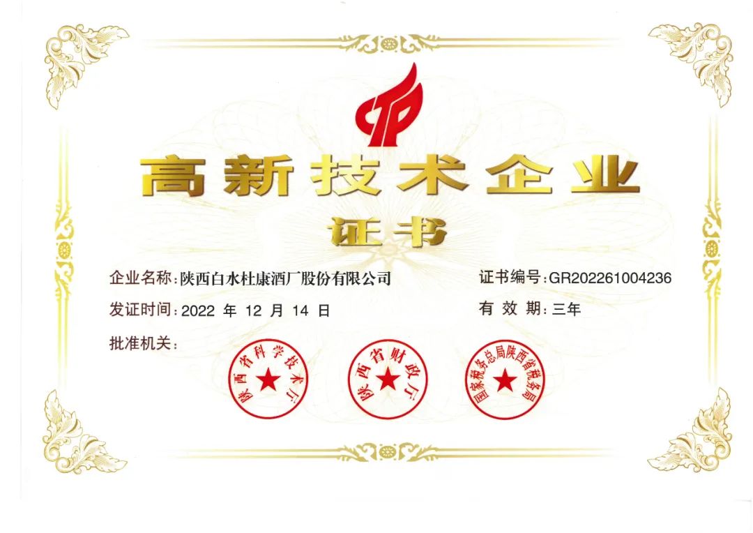 喜報——陝西91桃色视频观看酒廠股份有限公司獲“高新技術企業證書”