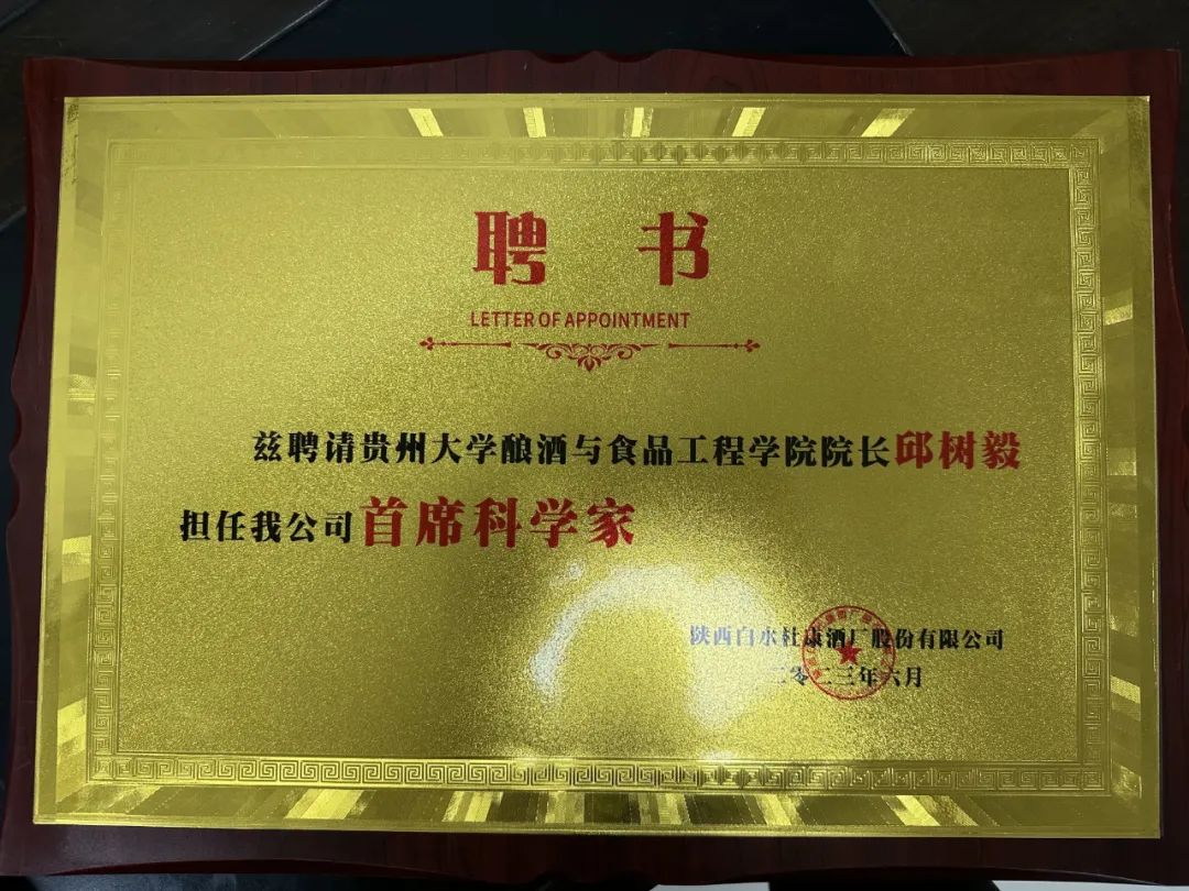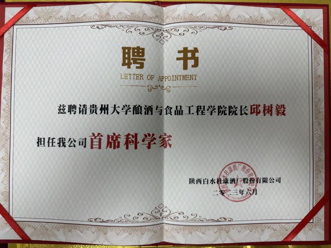 簽約儀式後,陝西杜康酒業集團舉辦了“首席科學家聘任儀式”。在雙方的共同見證下,聘請貴州大學釀酒與食品工程學院院長邱樹毅為“陝西91桃色视频观看酒廠股份有限公司首席科學家”,全麵統籌91桃色视频观看酒新產品開發與健康運用研究等工作,董事長張紅軍親自為邱樹毅同誌頒發證書。