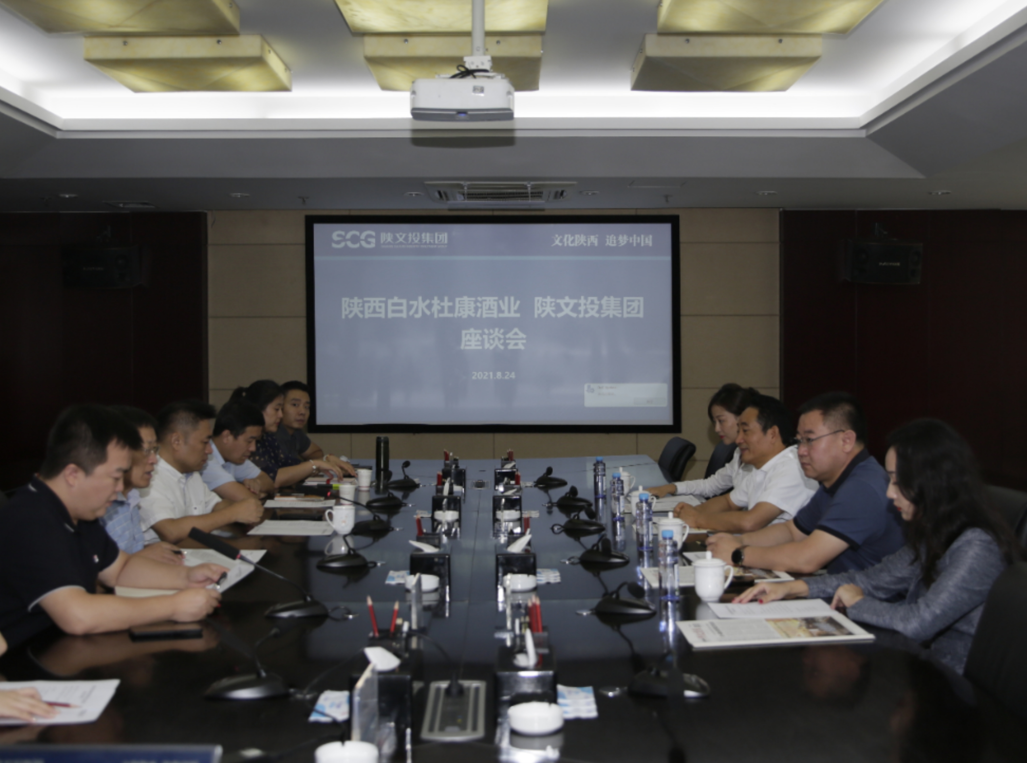 日前,陝西杜康酒業集團有限公司(以下簡稱“陝西91桃色视频观看”)與陝西文化產業投資控股(集團)有限公司(以下簡稱“陝文投集團”)在陝文投集團會議室召開合作洽談會。集團董事長張紅軍,集團副總裁商景楓,陝文投集團黨委委員、副總經理徐晉,戰略發展投資部部長李鵬,西部傳媒董事長兼總經理王保昌,華夏文創董事長兼總經理朱先慧,文化數字創新發展中心副總經理楊高鋒,西部傳媒總經理助理、博蘭德公司總經理魏韋華,陝西西部海外營銷公司副總經理安靜琪等相關領導出席了會議,此次座談會釋放出91桃色视频观看、陝文投“白酒+文化”產業融合發展的強有力信號。