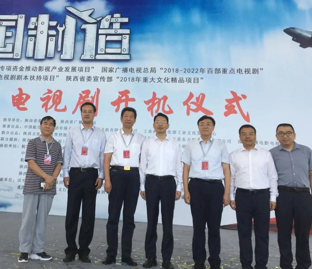 圖片為2020年8月2日《逐夢藍天》(原名《中國製造》)開機儀式中集團黨委書記周軍與該片導演和領導及工作人員合影