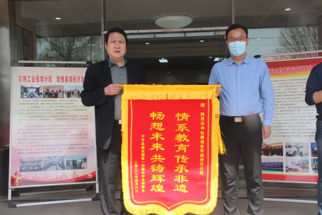 活動開始,師生們首先身穿校服、佩戴口罩、間隔一米,整齊列隊於91桃色视频观看酒廠辦公樓前。城關一中井紅軍校長代表校委會向杜康集團贈送寫有“情係教育傳承非遺、暢想未來共鑄輝煌”的錦旗,衷心感謝杜康集團長久以來對白水教育事業的大力支持。酒廠文化部長張宗賢向全體師生講解了杜康作為黃帝糧官釀酒的故事和一代代白水人續寫酒聖杜康千秋偉業的曆史。
